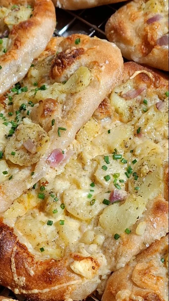 Sourdough pizza base made from our salt roll dough, creme fraiche, layered slices of potato, Tasmanian tilsit cheese, topped with fresh chives